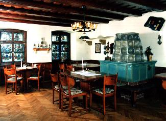 | Die Namen der Gasträume richteten sich nach den Motiven in den einmalig schönen Bleiglasfenstern in der unteren Etage. In der Erzgebirgs- und heutigen Weinstube befindet sich eine geradlinige Holzverkleidung mit schönen Nischen, erzgebirgische Volkskunst, ein Ofen mit Meißner Pfannen" und köstliche Weine aus der ganzen Welt. | ||||||||||||||||||||||||||||||||||||||||||||||||||||||||||||||